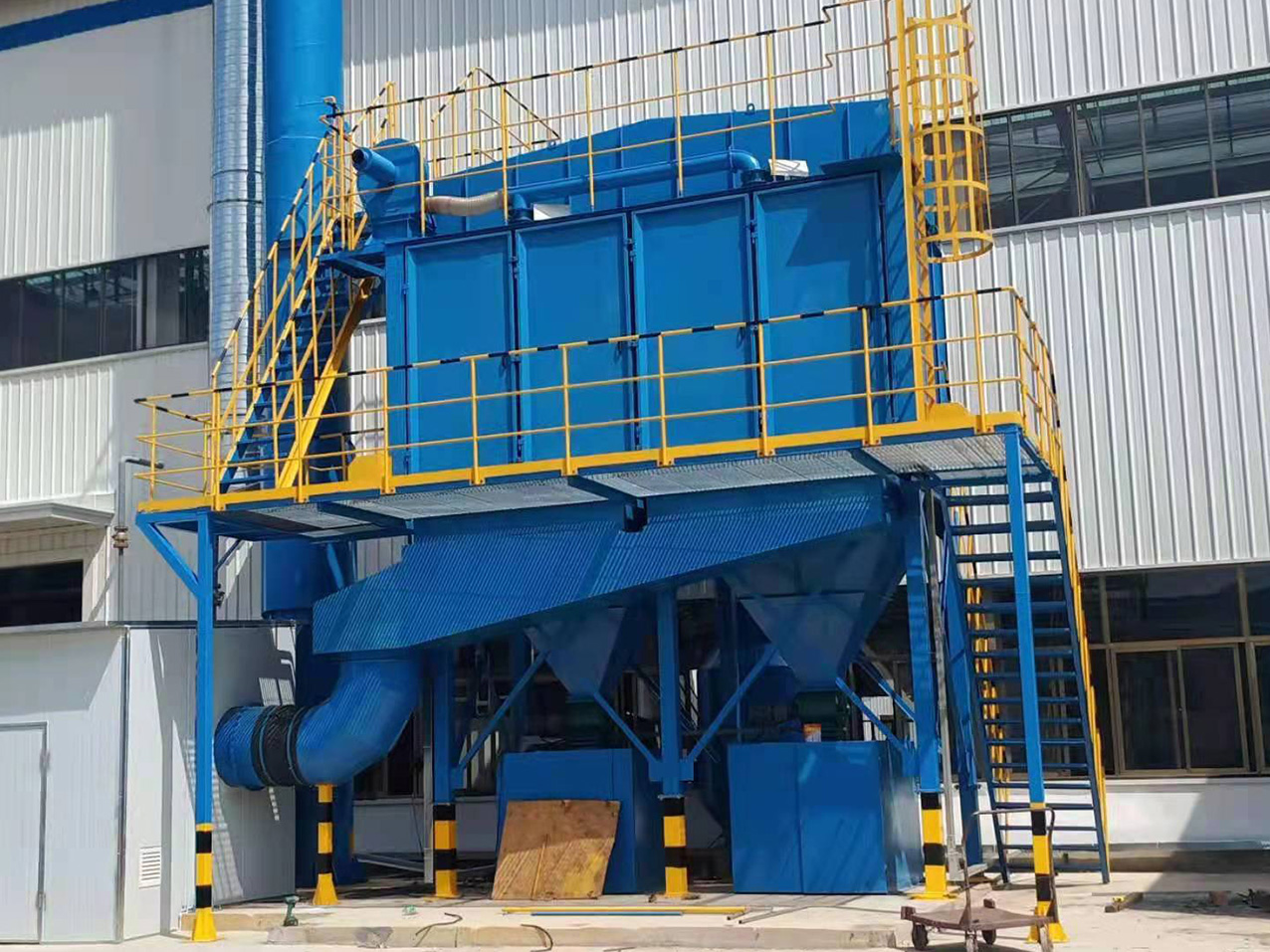 電爐除塵器裝置系統(tǒng)為:將來自工業(yè)硅生產(chǎn)電爐的煙氣,在離心式主風(fēng)機(jī)的抽吸作用下,煙氣由半封閉式電爐內(nèi)引出,沿著煙道首先進(jìn)入旋風(fēng)除塵器。把粗粒、火星分離出來,使其沉降于灰斗至卸料器排出。在有旋風(fēng)除塵器的出口排出,超細(xì)粉塵及含塵氣體進(jìn)入一個(gè)熱交換器,風(fēng)冷降低煙氣溫度,然后其它塵粒隨氣流上升進(jìn)入布袋除塵器各個(gè)袋室。經(jīng)濾袋過濾后,粉塵被阻留在濾袋外面,凈化后的氣體由濾袋進(jìn)入箱體,再通過袋口和上箱體(凈氣室)出風(fēng)口進(jìn)入離心式主風(fēng)機(jī)在排入煙囪至大氣?;叶分械姆蹓m定時(shí)或連續(xù)由卸灰系統(tǒng)排出。